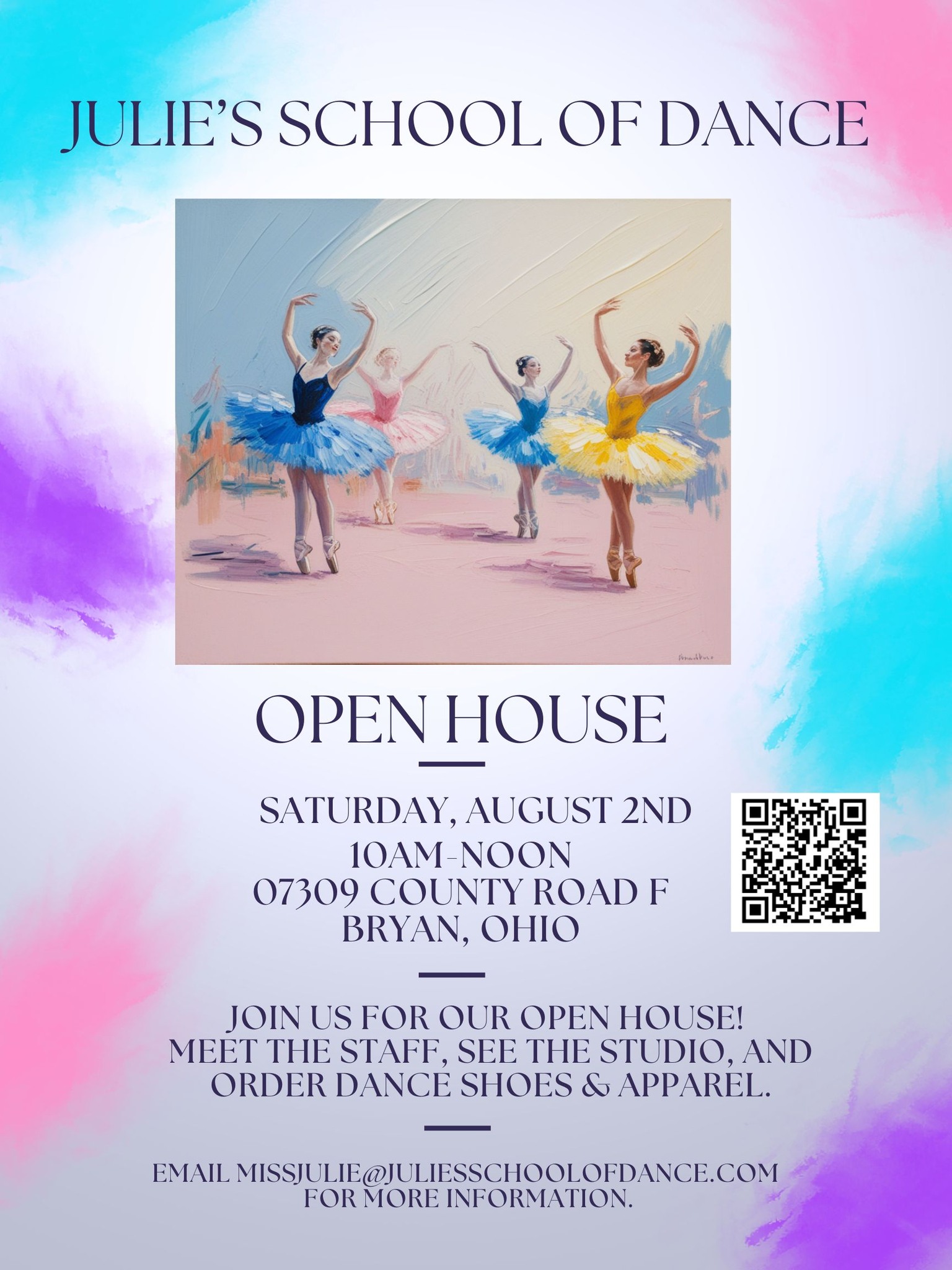 Julie's School of Dance is proud to have served the Northwest Ohio community since 1997. Teaching children and young adults ages three through eighteen, we offer ballet, creative movement, hip hop, jazz, modern, pointe, and tap classes, culminating with an annual recital. Annual recitals have showcased choreography that has received awards and standings by dance competitions including Dance Olympus, Hollywood Vibe, and Rainbow Connection. Our facilities boast a marley floor and a subfloor that cushions the joints when jumping or leaping. We are also the ONLY dance studio in the area whose instructor has a Master Degree in Dance. In 2007, the Pure Energy Dance Company was founded as a pre-professional youth company who perform at various venues including the Embassy Theatre in Fort Wayne and throughout Northwest Ohio and Northeast Indiana.